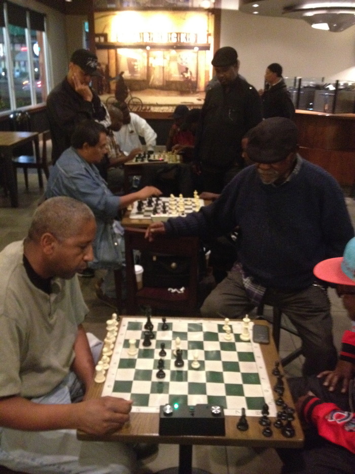 Meanwhile, Wacko – a 40 year old Af-Am male, former gangbanger-, Cheddar – a 35 year old Af- Am male, former Soul Train Dancer-, Cleo – a handsome 25 year old weed head-, and Do Nothing – A 30 year old white homeless male- are playing dominos on the Starbucks patio when they spot Kansas – a 60 year old Af- Am male former pimp/hustler- walking to his car in the parking lot. Wacko calls out to Kansas because he still owes him money for gambling on the FIDE World Chess Championship between Magnus Carlsen and Viswanathan Anand that took place over the course of 10 games in Chennai, India. Kansas bet on Anand, thinking that age would triumph over youth. He is now 5,000 dollars in the hole to Wacko. Kansas waves Wacko off, and gets in his car and drives off. Wacko takes notice, but continues playing dominos.